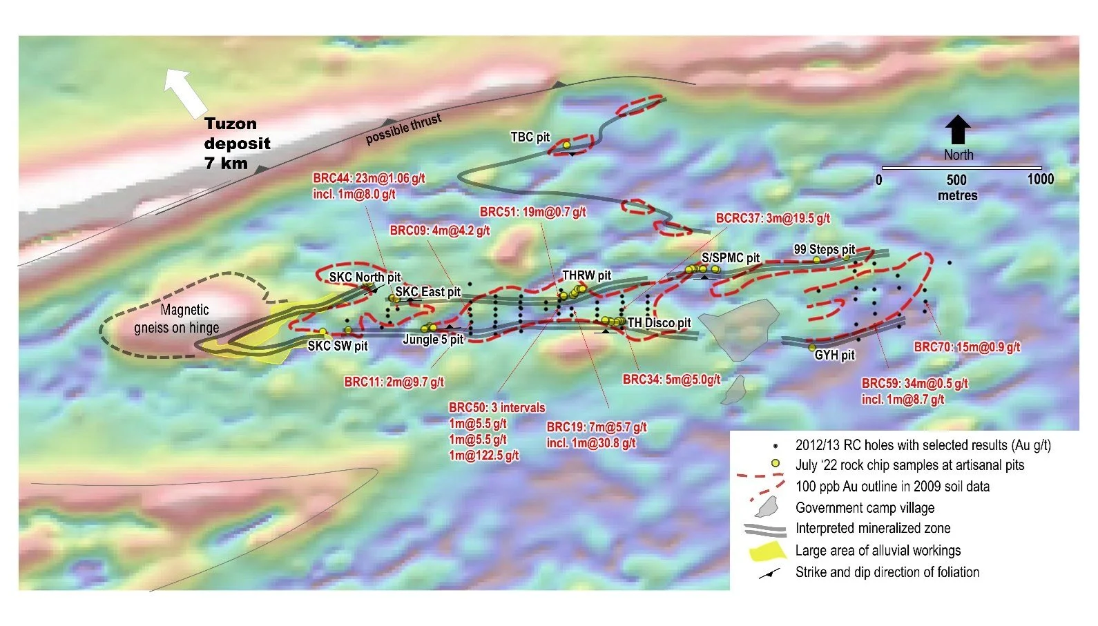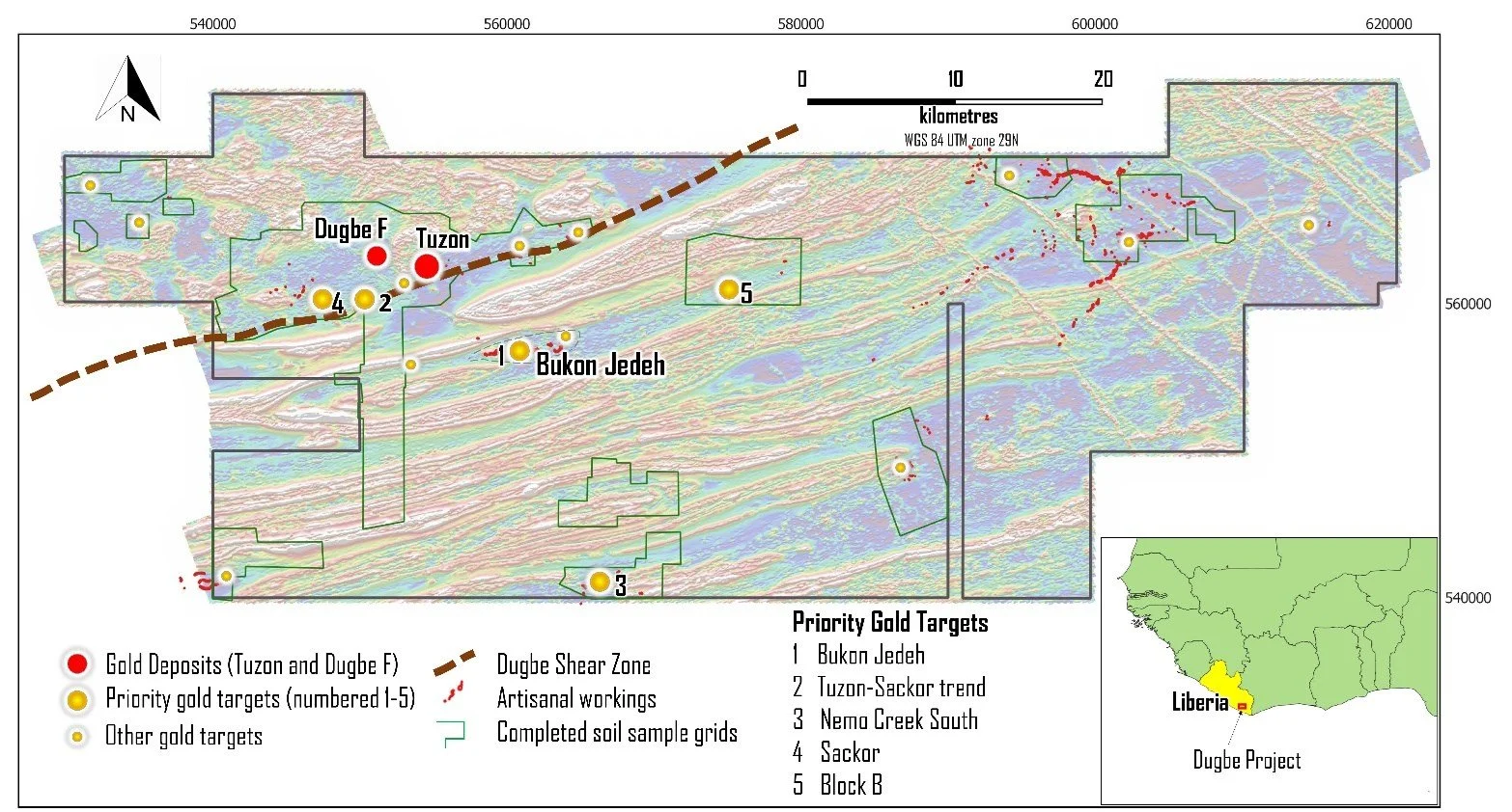 "These samples indicate the potential for additional zones of high-grade gold, and that exploration undertaken by prior operators largely missed what is now a string of pits on a 4 km-long zone. This is a clear opportunity to bring more gold to the planned 200koz gold per annum production from the nearby Tuzon and Dugbe F deposits, a production rate determined by our recently completed Feasibility Study[2]"